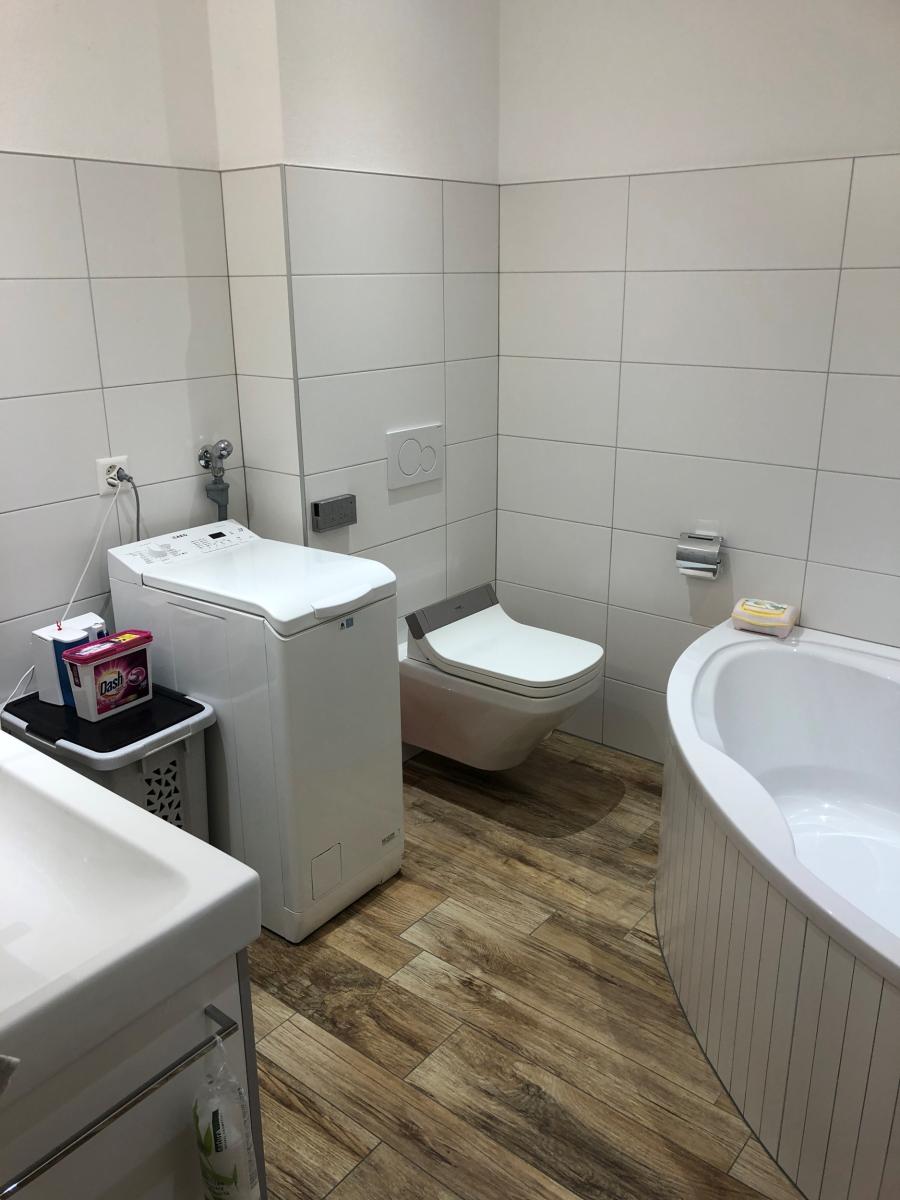 Badezimmer mit Eckbadewanne und Waschmaschine