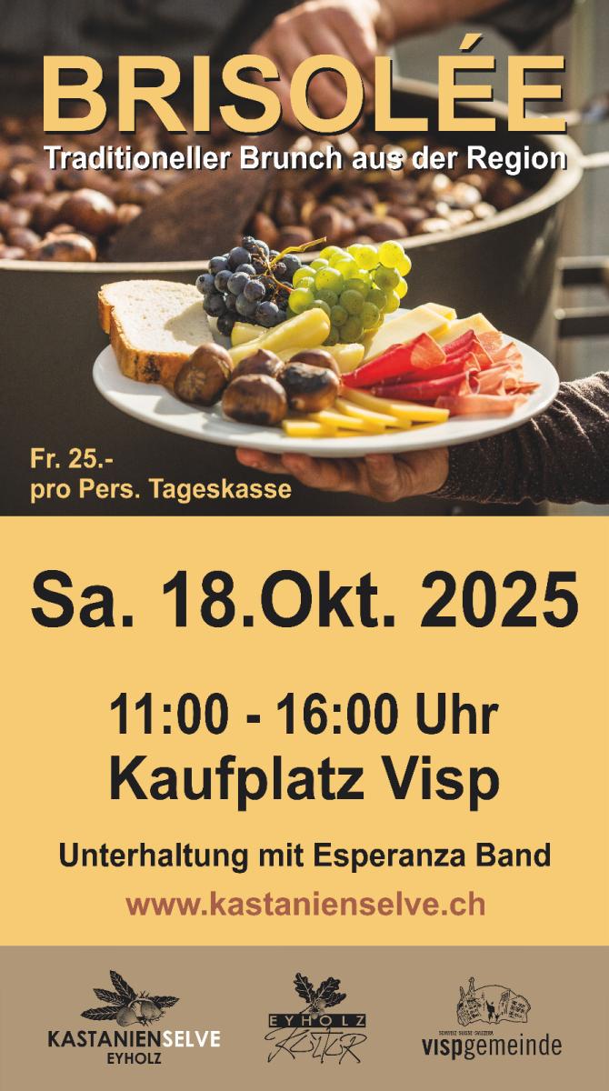 Herbstzeit ist auch dieses Jahr wieder die Zeit des Brisolée. Am Samstag, 18. Oktober 2025 erhalten Gäste und Einheimische die Gelegenheit in Visp ein traditionelles Brisolée zu geniessen.
