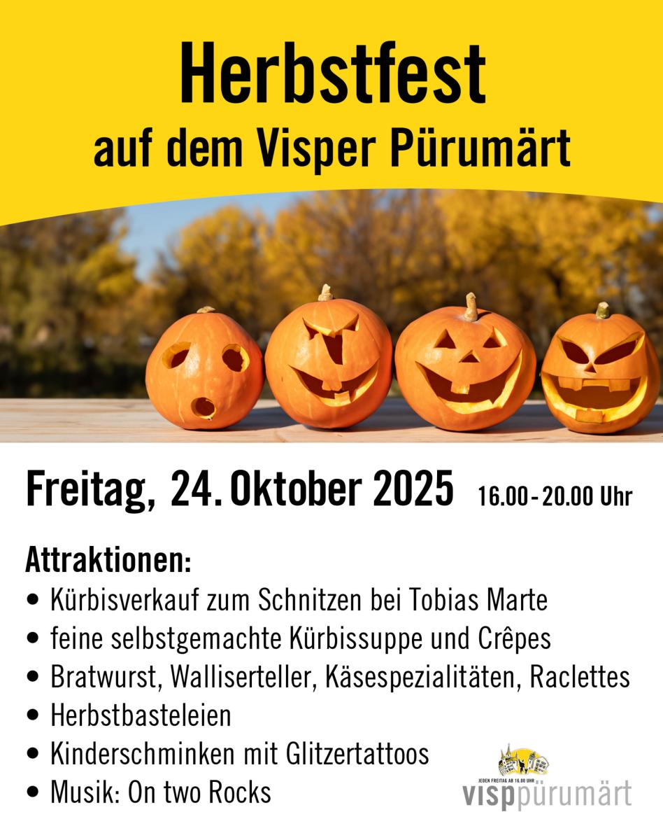 Der Pürumärt Visp zeigt sich im farbig-prächtigen Herbstkleid! Gemeinsam mit unseren Marktanbietern feiern wir den Herbst mit feinen regionalen Spezialitäten, musikalischer Unterhaltung und vielen Attraktionen für Gross und Klein.