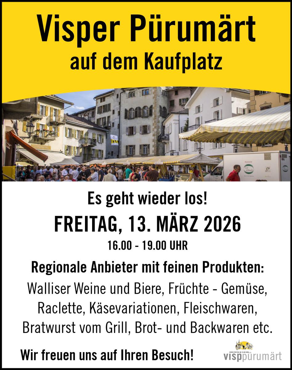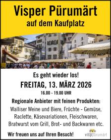 Kommen Sie vorbei und geniessen Sie die herzliche und gemütliche Ambiance am Visper Pürumärt (16.00 – 19.00 / 20.00 Uhr).
